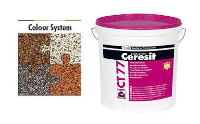 Ceresit CT 77 jest tynkiem mozaikowym, produkowanym w kilkudziesięciu kompozycjach kolorystycznych. Jest on gotowy do użycia, odporny na warunki atmosferyczne oraz szorowanie, jest łatwy do utrzymania w czystości i posiada formułę BioProtect, która jest odporna na rozwój grzybów, alg i pleśni. Tynk Ceresit CT 77 służy do wykonywania ozdobnych, barwnych wypraw tynkarskich na tradycyjnych tynkach, na podłożach betonowych, gipsowych oraz na płytach wiórowych, gipsowo-kartonowych itp. Spoiwem są tu transparentne żywice, a wypełniaczami kolorowe żwirki kwarcowe o uziarnieniu 0,8–1,2 mm (kolory oznaczone literą D), żwirki kwarcowe o uziarnieniu 1,4–2,0 mm (kolory oznaczone tylko cyframi) lub naturalne łamane kruszywo marmurowe o uziarnieniu 1,4-2,0 mm (kolory oznaczone literą M). Ceresit CT 77 przeznaczony jest do nakładania i wygładzania metalową pacą. Po związaniu uzyskuje się barwną wyprawę. Właściwości materiału pozwalają mostkować istniejące w podłożu włosowate rysy. Szczególnie zalecany jest do stosowania na wyeksponowanych, narażonych na wycieranie ścianach wewnątrz budynków, np. przy wejściach, na korytarzach, na klatkach schodowych. Na zewnątrz budynków, Ceresit CT 77 zaleca się stosować na powierzchniach ulegających szybkiemu zabrudzeniu: na cokołach, balustradach, w ościeżach okien i drzwi. W przypadku intensywnych, ciemnych kolorów, stosowanie go jako warstwy elewacyjnej w systemie ociepleń budynków Ceresit Ceretherm (z zastosowaniem płyt styropianowych) powinno być ograniczone do małych powierzchni, np. cokołów czy detali architektonicznych. BioProtect to skuteczna i trwała ochrona elewacji przed skażeniem biologicznym, rozwojem pleśni, grzybów i alg. Dzięki specjalnym kapsułom z zawartością środka biobójczego uwolnienie substancji następuje w sposób kontrolowany, zapewniając długotrwały efekt.