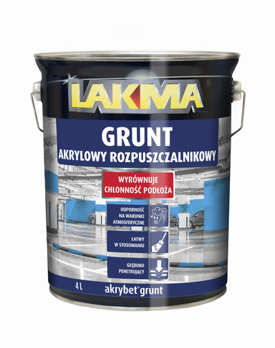 Lakma AKRYBET GRUNT jest rozpuszczalnikowym podkładam akrylowym, zwiększającym przyczepność powierzchni. Znajduje zastosowanie do wzmacniania materiałów, takich jak: beton, podłoża cementowe i cementowo-wapienne oraz podłoża eternitowe. Podkład gruntujący Lakma AKRYBET GRUNT uszczelnia, umacnia i impregnuje pokryte nim powierzchnie. Szczególnie polecany jest do stosowania przed malowaniem farbami akrylowymi, takimi jak Akrybet BETON i Akrybet B30 Posadzka. Podkład gruntujący Lakma AKRYBET GRUNT doskonale nadaje się także do gruntowania podłoży przed montażem na nich okładzin ceramicznych oraz takich, które uległy erozji biologicznej. Charakteryzuje się wodoodpornością oraz odpornością na działanie alkaliów i niekorzystnych warunków atmosferycznych.