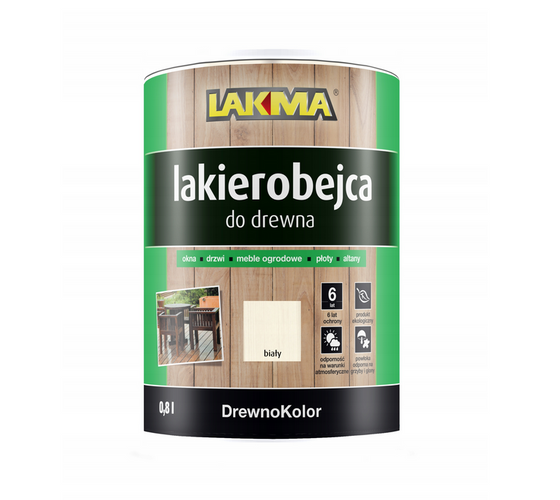 Lakma DREWNOKOLOR LAKIEROBEJCA jest środkiem służącym do dekoracji i ochrony drewna. Jest on wodorozcieńczalny, produkowany na bazie dyspersji akrylowej, szybkoschnący i odporny na sklejanie. Ponad to podkreśla naturalny rysunek słoi, chroni drewno przed czynnikami atmosferycznymi i promieniowaniem UV oraz zasiedlaniem przez grzyby. Lakma DREWNOKOLOR LAKIEROBEJCA nadaje się do malowania powierzchni drewnianych i drewnopochodnych zarówno we wnętrzach jak i na zewnątrz: pergoli ogrodowych, boazerii, okien, płotów, drzwi, mebli ogrodowych i altan.