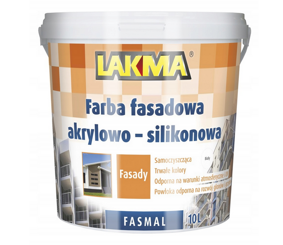 Lakma FASMAL to farba fasadowa, która jest produkowana na bazie dyspersji akrylowej, emulsji silikonowych, modyfikatorów i pigmentów. Jest ona dobrze przyczepna, daje matowe i gładkie powłoki, o dobrym kryciu i odporna na szorowanie, czynniki atmosferyczne, porost grzybów i glonów oraz promieniowanie UV. Lakma FASMAL nadaje się do malowania podłoży cementowych, cementowo-wapiennych, oraz tynków cienkowarstwowych - mineralnych, akrylowych, silikonowych, silikatowych lub silikonowo-silikatowych w przypadku ocieplania płytami styropianowymi. Można także z jej użyciem malować przedmioty z materiałów takich jak beton, tynk, cegła, kamień, drewno i materiały drewnopochodne.