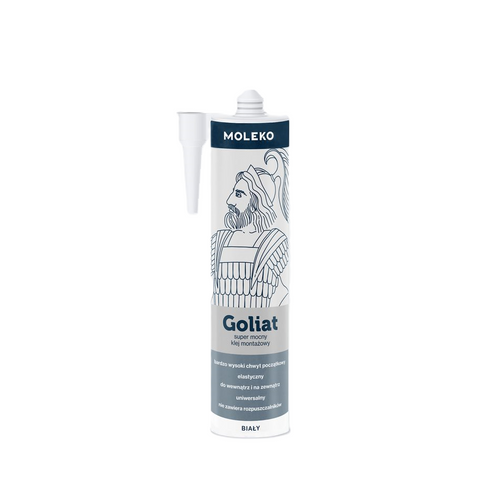 Moleko Goliat super mocny klej montażowy jest klejem przeznaczonym do klejenia parapetów, stopnic i progów, wykonanych z drewna, marmuru, kamienia i PVC, do podłoża betonowego, wewnątrz budynków. Może być również stosowa-ny do klejenia listew przypodłogowych, paneli ściennych i elementów wykończeniowych wykonanych z drewna, materiałów drewnopochodnych (MDF, HDF), PVC,surowego aluminium, szkła lakierowanego, wykończeniowych elementów okładzinowych z płyt lustrzanych oraz wykończeniowych elementów dekoracyjnych z EPS oraz XPS, do podłoża betonowego, wewnątrz budynków. Ponadto klej przeznaczony jest dla budownictwa, do klejenia wewnątrz i na zewnątrz, w miejscach nienarażonych na bezpośrednie oddziaływanie wody.