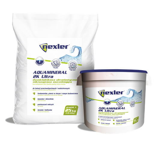 NEXLER AQUAMINERAL 2K ULTRA Dwuskładnikowa ultraelastyczna mikrozaprawa do wykonywania hydroizolacji tarasów i balkonów oraz hydroizolacji przeciwwodnych i przeciwwilgociowych.