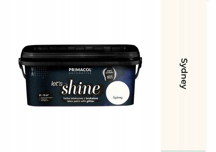 Primacol LET'S SHINE to farba wysokiej jakości, dzięki której można uzyskać efekt satynowej powierzchni, która połyskuje mnóstwem srebrnych drobinek. Subtelny połysk wzmaga się przy intensywnym oświetleniu. Farba nadaje się do malowania sufitów i ścian we wnętrzach: salonach, korytarzach, pokojach dziennych, hotelach, salach konferencyjnych oraz w restauracjach. Primacol LET'S SHINE jest dobrze kryjącą, wodną farbą lateksową, która jest wysoce odporna na zmazywanie. Stosuje się ją do malowania tynków gipsowych i mineralnych, cegieł, płyt G-K, powierzchni drewnopochodnych i drewnianych, a także tapet z włókna szklanego.