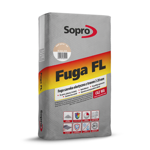 Sopro FL FUGA SZEROKA jest elastyczną, mrozoodporną, szybkowiążącą, cementową zaprawą fugową, zawierającą tras reński. Przeznaczona jest do spoinowania okładzin wykonanych ze słabo chłonnych lub niechłonnych materiałów takich jak: płytki kamionkowe, gres, ceramiczne płyty łupane, klinkier, kamień naturalny, szklane kształtki budowlane oraz płyty betonowe. Sopro FL FUGA SZEROKA doskonale sprawdza się do stosowania w pomieszczeniach i na zewnątrz, na balkonach, tarasach i elewacjach oraz na podłogach ogrzewanych. Nadaje się do wykonywania spoin w zakresie 2-20 mm. Sopro FL FUGA SZEROKA wiąże bez powstawania rys i umożliwia szybkie użytkowanie wykonanych okładzin. Dzięki optymalnemu czasowi zmywania charakteryzuje się wysoką wydajnością pracy na dużych powierzchniach. |