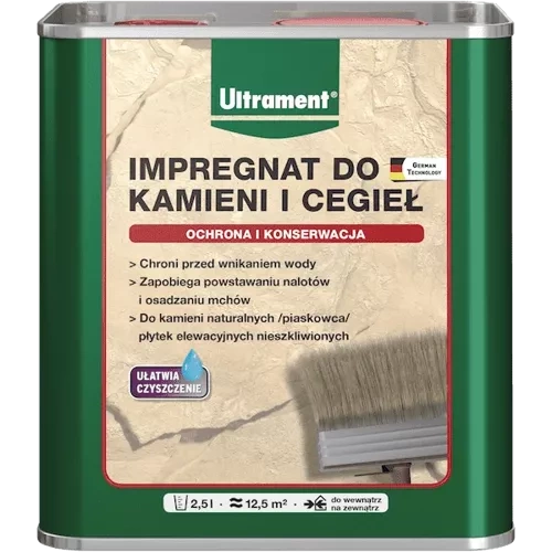 ULTRAMENT IMPREGNAT DO KAMIENI I CEGIEŁ – produkt przeznaczony do zabezpieczenia i impregnacji powierzchni wykonanych z kamienia naturalnego wewnątrz i na zewnątrz budynków, piaskowca, betonu komórkowego, cegły ceramicznej i klinkierowej oraz nieszkliwionej kamionki. Głęboko wnika w pory podłoża oraz mikropęknięcia tworząc silnie hydrofobową warstwę nieprzepuszczającą wilgoci oraz wody opadowej powodującą uszkodzenia podczas zamarzania. Dodatkowo zapobiega osiadaniu alg i mchu, a także powstawaniu wykwitów. Po wyschnięciu zaimpregnowana powierzchnia nie zmienia zabarwienia i wyglądu.