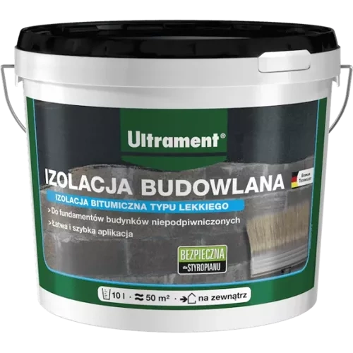 - ULTRAMENT IZOLACJA BUDOWLANA – czarna, cienkowarstwowa powłoka bitumiczna przeznaczona do zabezpieczenia przeciw wilgoci stykających się z gruntem części budynków i budowli. 10 l.