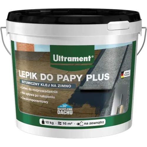 ULTRAMENT LEPIK DO PAPY PLUS – dwukomponentowy, szybko wiążący lepik bitumiczny przeznaczony do przyklejania pap bitumicznych i asfaltowych (powłokowych, izolacyjnych) na małych i dużych powierzchniach na zewnątrz budynków. Dzięki odpowiedniej recepturze produkt można stosować na podłożach betonowych, drewnianych, starych bitumicznych papach i pokryciach występujących na dachach o nachyleniu do 30 stopni. Materiał nie jest przeznaczony do klejenia pap smołowych, pap asfaltowych na taśmach aluminiowych oraz na podłoża smołowe.