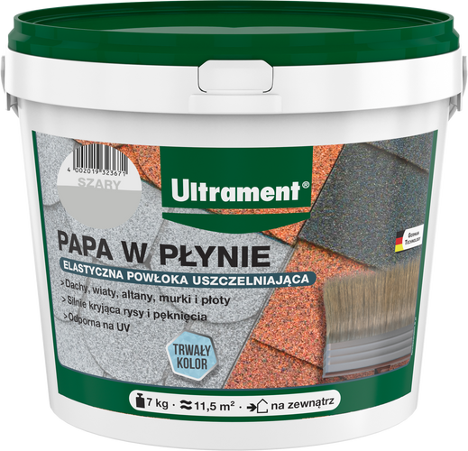 Papa w płynie Ultrament jest idealna do odnawiania powierzchni takich jak papa, gonty, opierzenia, dachówki, blacha trapezowa, eternit, drewno i inne elementy architektury ogrodowej (altany, wiaty, skrzynie na narzędzia). Dzięki doskonałej przyczepności do różnych materiałów, tworzy elastyczną i odporną na wodę oraz UV powłokę. Produkt jest szybkoschnący i łatwy w aplikacji. Przygotowanie podłoża, Podłoże powinno być suche, czyste, mocne i stabilne. Podłoża chłonne należy zagruntować akrylowym gruntem, natomiast powierzchnie niechłonne rozcieńczoną farbą (1:5). Obróbka : Przed użyciem produkt należy wymieszać. Farbę nakładać pędzlem, wałkiem lub natryskiem (dysza min. 3 mm, ciśnienie 5 bar). Nakładać co najmniej 2 warstwy, a dla uszczelnienia min. 1 mm grubości na gotowo. Czas schnięcia każdej warstwy to 2-3 godziny, pełne utwardzenie po 12-24 godzinach.