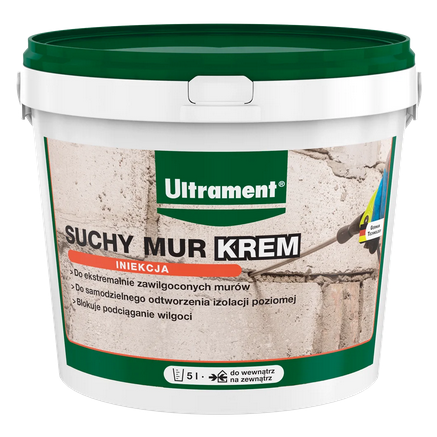 - ULTRAMENT SUCHY MUR KREM jest gotowym do użycia preparatem na bazie silanów i siloksanów przeznaczonym do odtworzenia izolacji poziomej w silnie zawilgoconych murach.